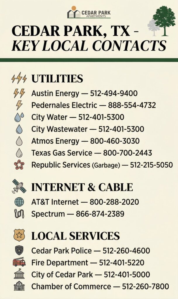 In Pedernales Electric Cooperative areas (most of Leander, parts of western Cedar Park), there’s no choice. You sign up directly with PEC at their fixed rate. Ask your leasing office which utility territory the property falls in before you sign. It affects both your options and your monthly cost.