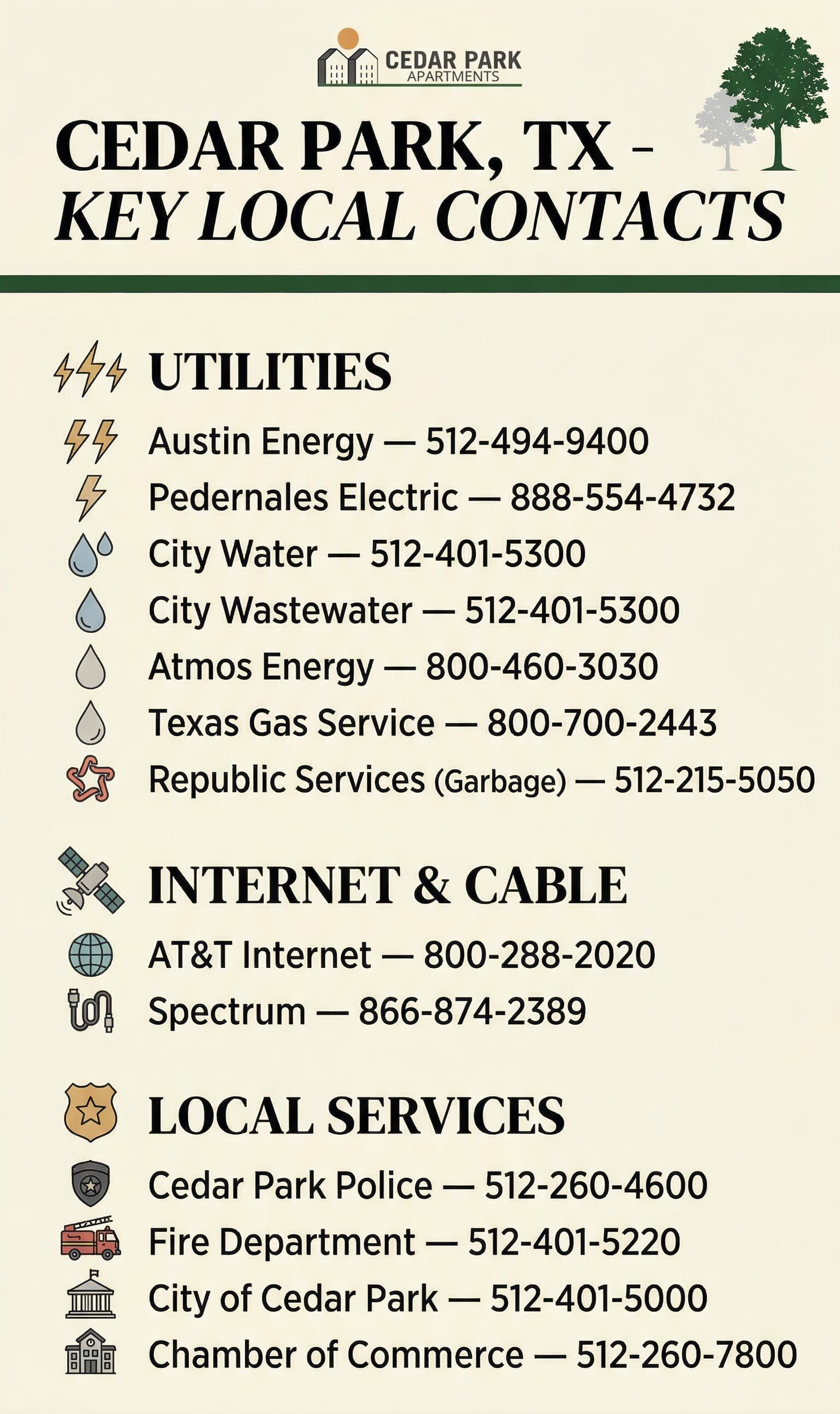 Cedar Park spans multiple utility territories: Oncor (deregulated, rates 7.9-12 cents/kWh), Pedernales Electric Cooperative (fixed rate, 12.24 cents/kWh), and Austin Energy in some areas. A 2BR apartment that runs $70-$110/month in spring can hit $140-$225 in July and August as cooling costs take over.